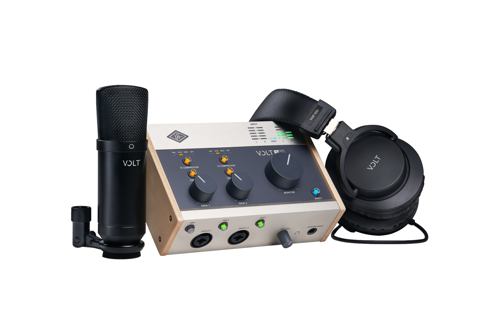 Everything you need for album-quality music productions. Volt Studio Packs are the perfect way to jumpstart your home recording studio. Capture your music productions, livestreams, and podcasts with Universal Audio's 2-in/2-out Volt 276 recording interface, featuring a Vintage Mic Preamp and built-in 76 compressor for classic studio sound. This studio pack includes a condenser mic and cable, studio monitoring headphones, and a suite of music production software. So you'll be recording like a pro, with album-ready sound right out of the box. Capture Classic Vocals with Vintage Mic Preamp Mode Few sounds can compare to a vintage Universal Audio 610 tube preamp, used to record everyone from Ray Charles to Van Halen. Volt 276 gives you the rich, full sound of this classic UA mic/line/instrument preamp, thanks to its built-in tube emulation circuitry, a UA exclusive. Control Volume Peaks with UA Compression Get album-ready punch and presence with Volt 276's onboard 76 Compressor — an innovative analog circuit inspired by UA's classic 1176 Limiting Amplifier. The 76 Compressor features three perfectly tailored presets to tame voice, guitars, synths, and drum machines. Just plug in, pick a setting, and play. Create with a Curated Suite of Audio Software Some audio interfaces give you a smattering of random audio apps. Not Volt. Instead, UA put together a bundle of serious music production tools, virtual instruments, and plug-ins including Ableton, Melodyne, UJAM's Virtual Drummer, Marshall, Ampeg, and more.